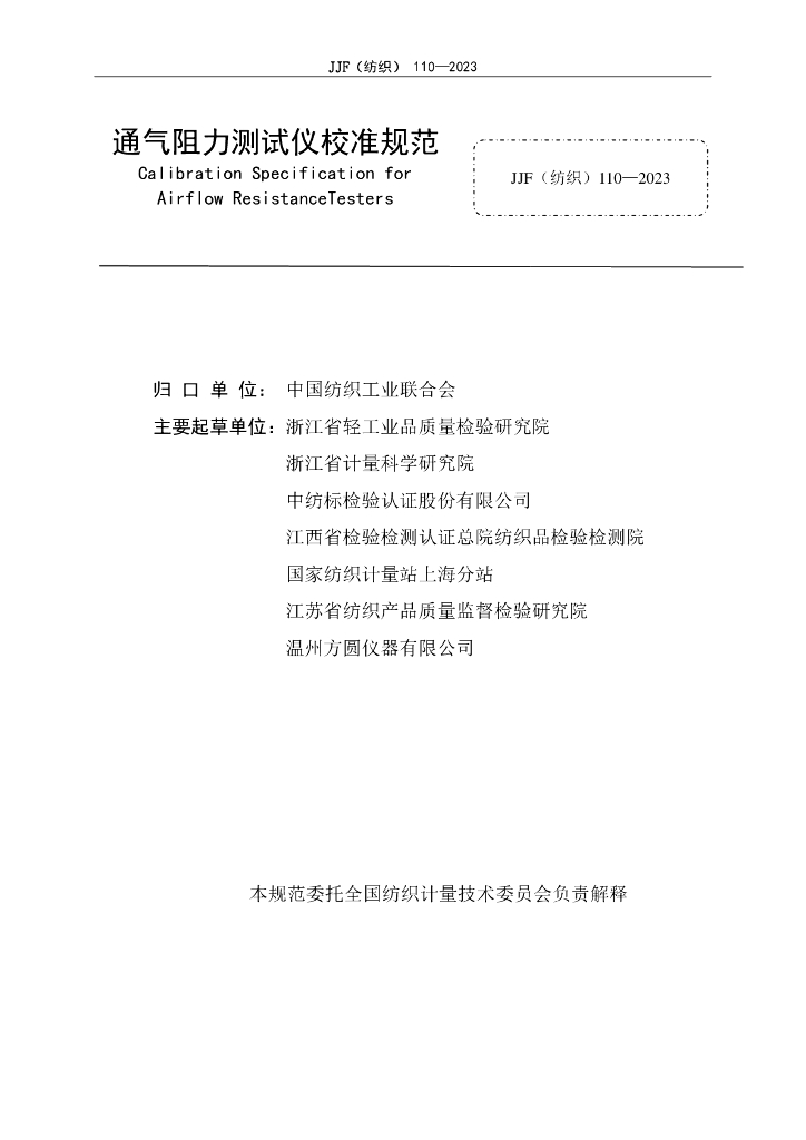 JJF(纺织)110-2023 通气阻力测试仪校准规范(报批稿)