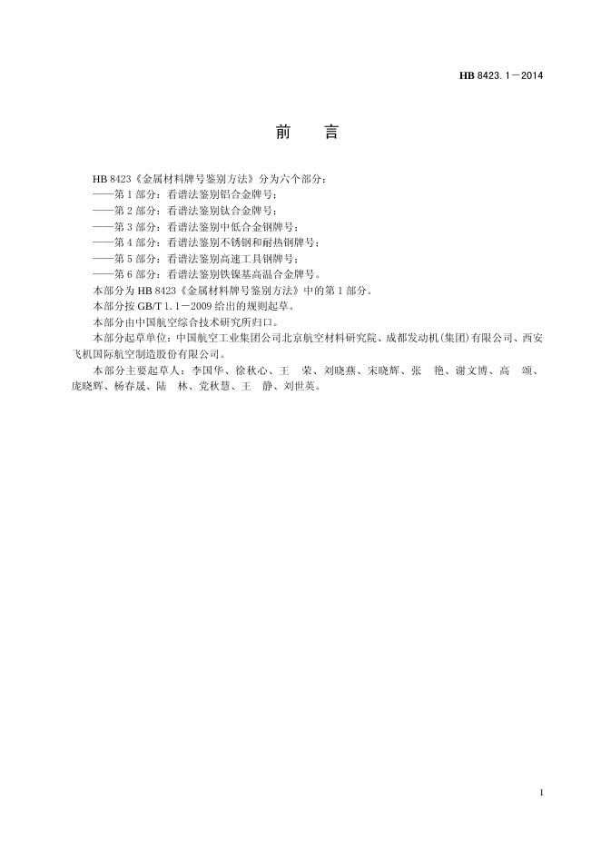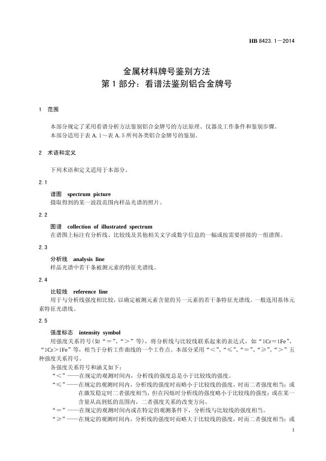 HB 8423.1-2014(2017) 金属材料牌号鉴别方法 第1部分:看谱法鉴别铝合金牌号