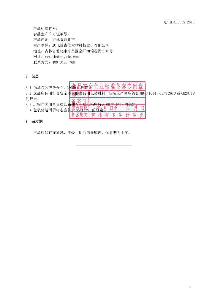 Q/THSX 0003S-2016 通化盛吉信生物科技股份有限公司 红参须制品