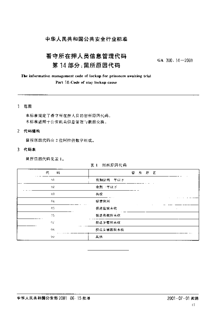 GA 300.14-2001 看守所在押人员信息管理代码 第14部分:留所原因代码
