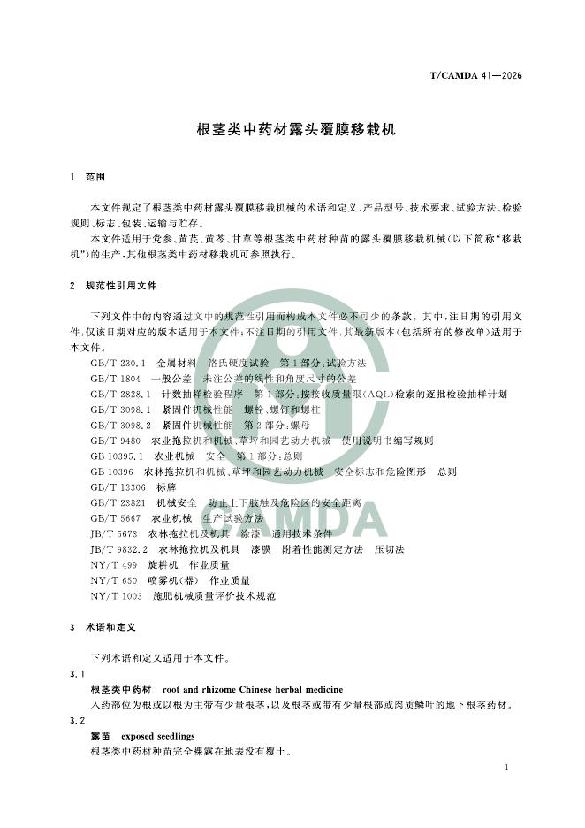 T/CAMDA 41-2026 根茎类中药材露头覆膜移栽机