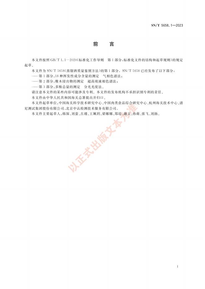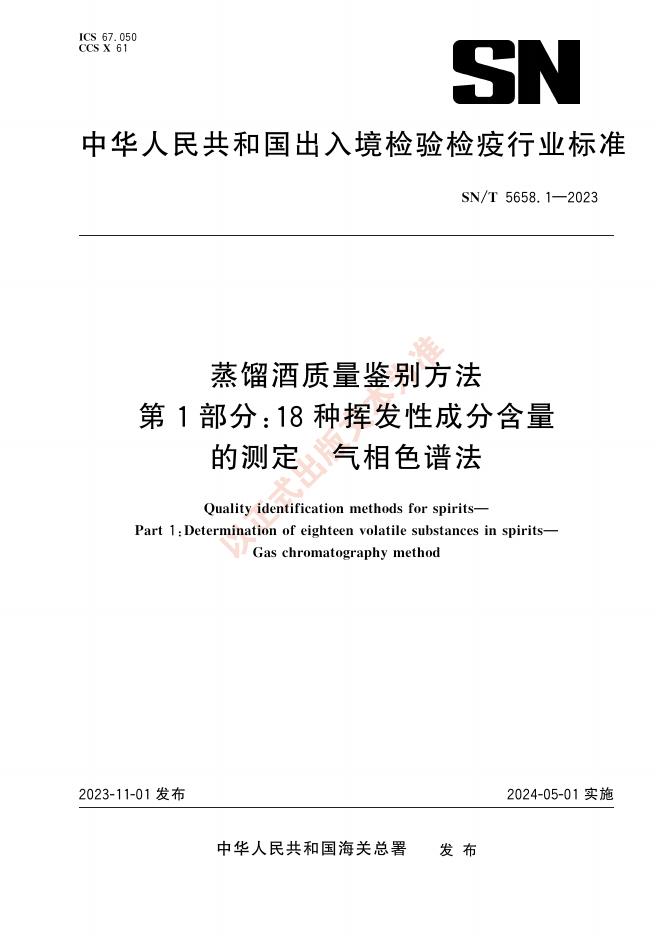 SN/T 5658.1-2023 蒸馏酒质量鉴别方法 第1部分:18种挥发性成分含量的测定 气相色谱法