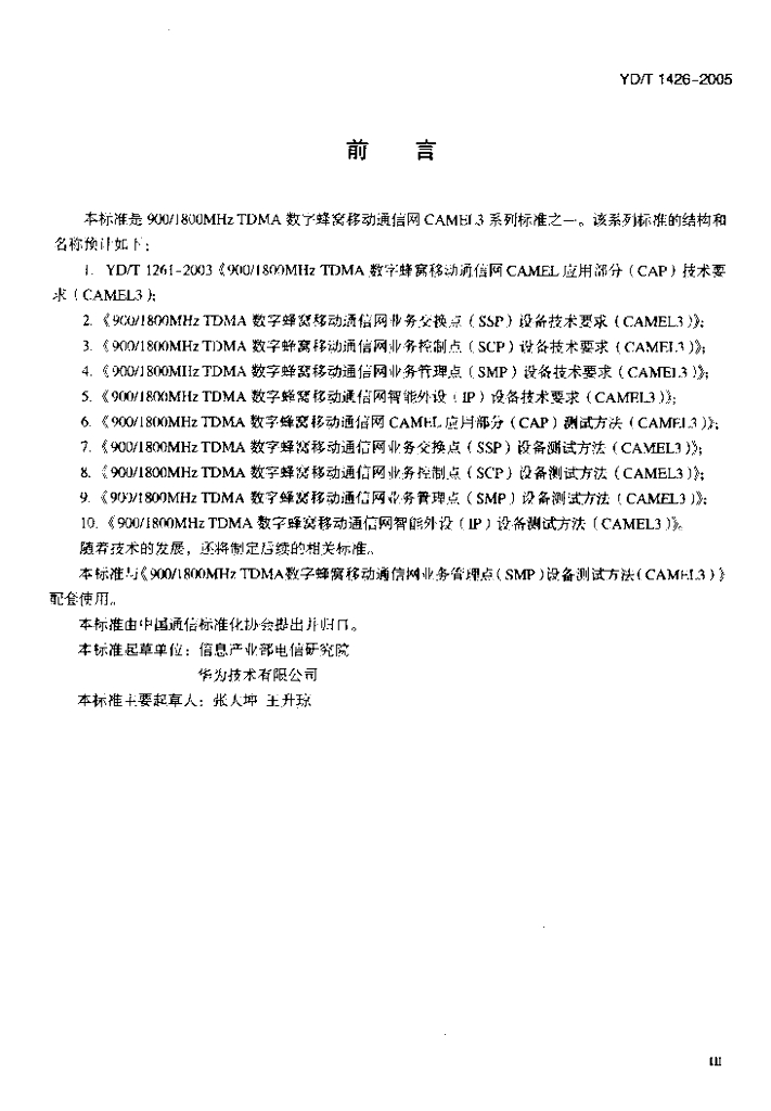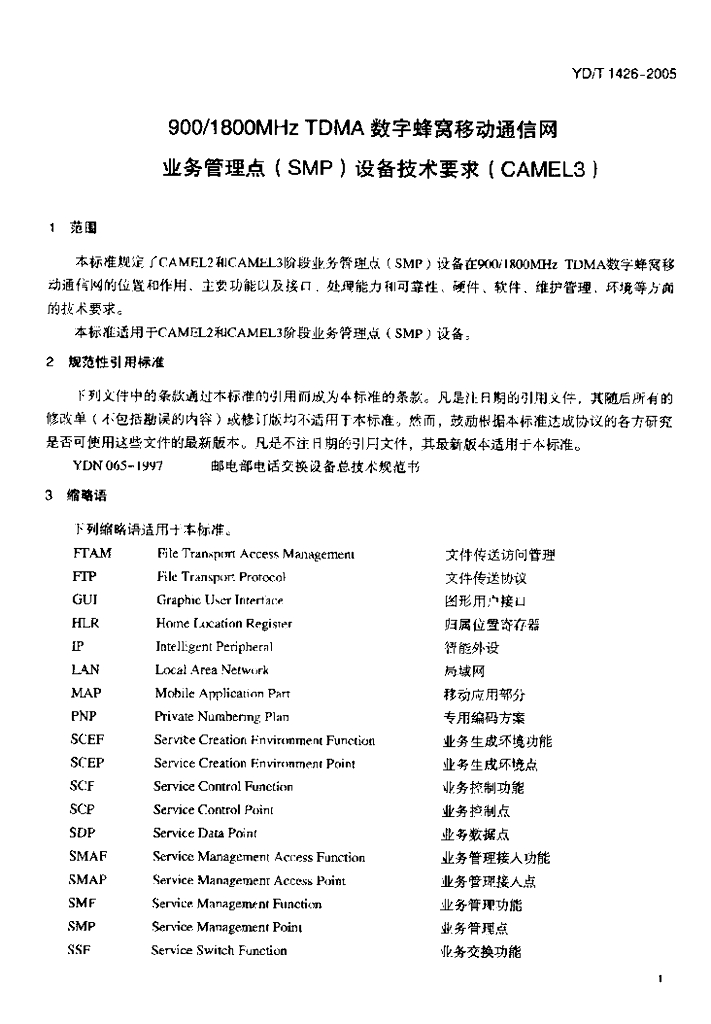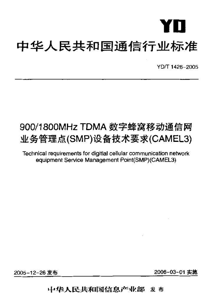 YD/T 1426-2005 900/1800MHz TDMA 数字蜂窝移动通信网业务管理点(SMP)设备技术要求(CAMEL3)