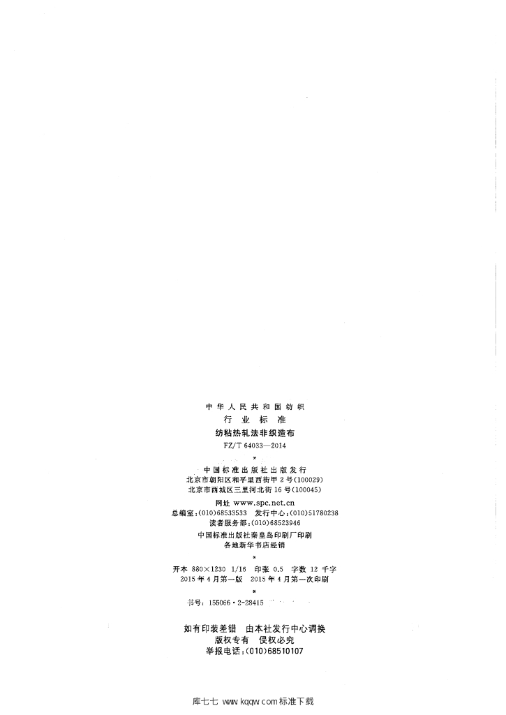 FZ/T 64033-2014 纺粘热轧法非织造布