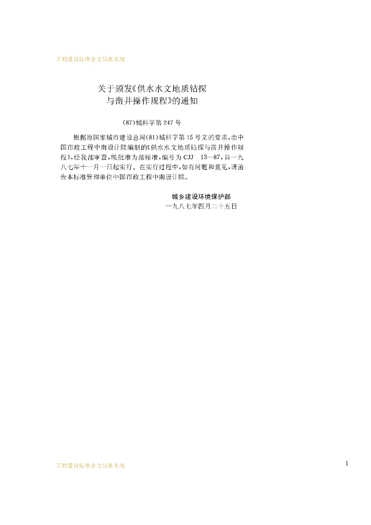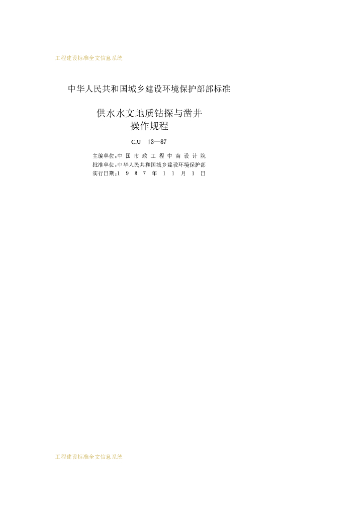 CJJ 13-1987 供水水文地质钻探与凿井操作规程