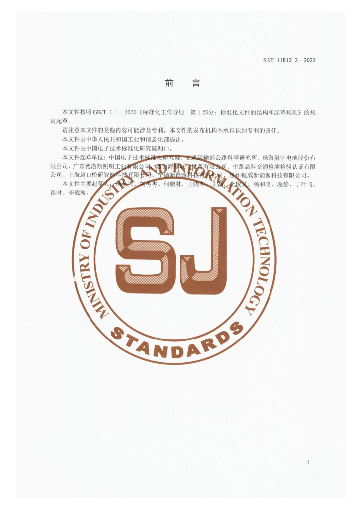 中国电子技术标准化研究院、交通运输部公路科学研究所、珠海冠宇电池股份有限公司、广东德洛斯照明工业有限公司、烟台海博电气设备有限公司、中路高科交通检测检验认证有限公司、上海道口松研智能科技有限公司、宁德新能源科技有限公司、惠州锂威新能源科技有限公司