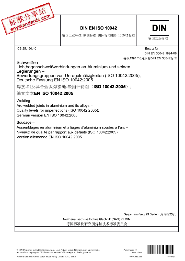 DIN EN ISO 10042-2006 焊接-铝及其合金弧焊接缝-缺陷评价组(D-C)