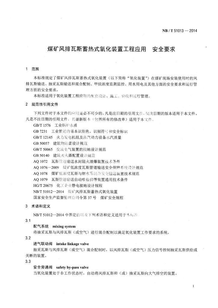 NB/T 51013-2014 煤矿风排瓦斯蓄热式氧化装置工程应用 安全要求