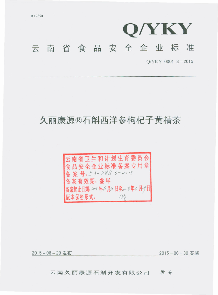 Q/YKY 0001S-2015 云南久丽康源石斛开发有限公司 久丽康源石斛西洋参枸杞子黄精茶