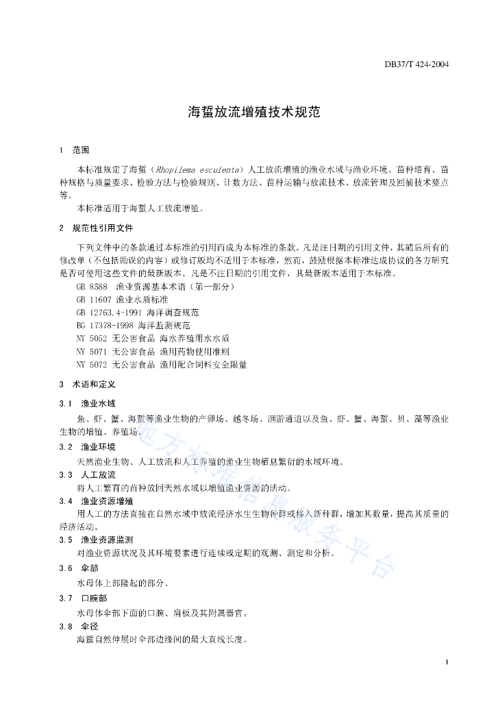 DB37/T 424-2004 海蜇放流增殖技术规范
