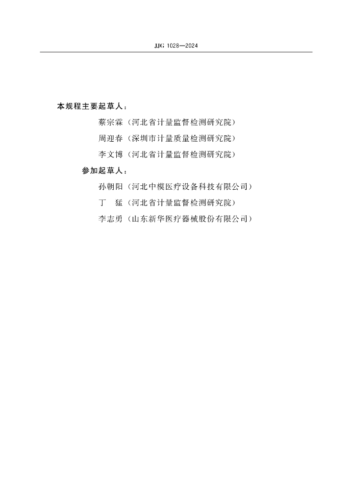 蔡宗霖(河北省计量监督检测研究院)、周迎春(深圳市计量质量检测研究院)、李文博(河北省计量监督检测研究院)、孙朝阳(河北中模医疗设备科技有限公司)、丁猛(河北省计量监督检测研究院)、李志勇(山东新华医疗器械股份有限公司)