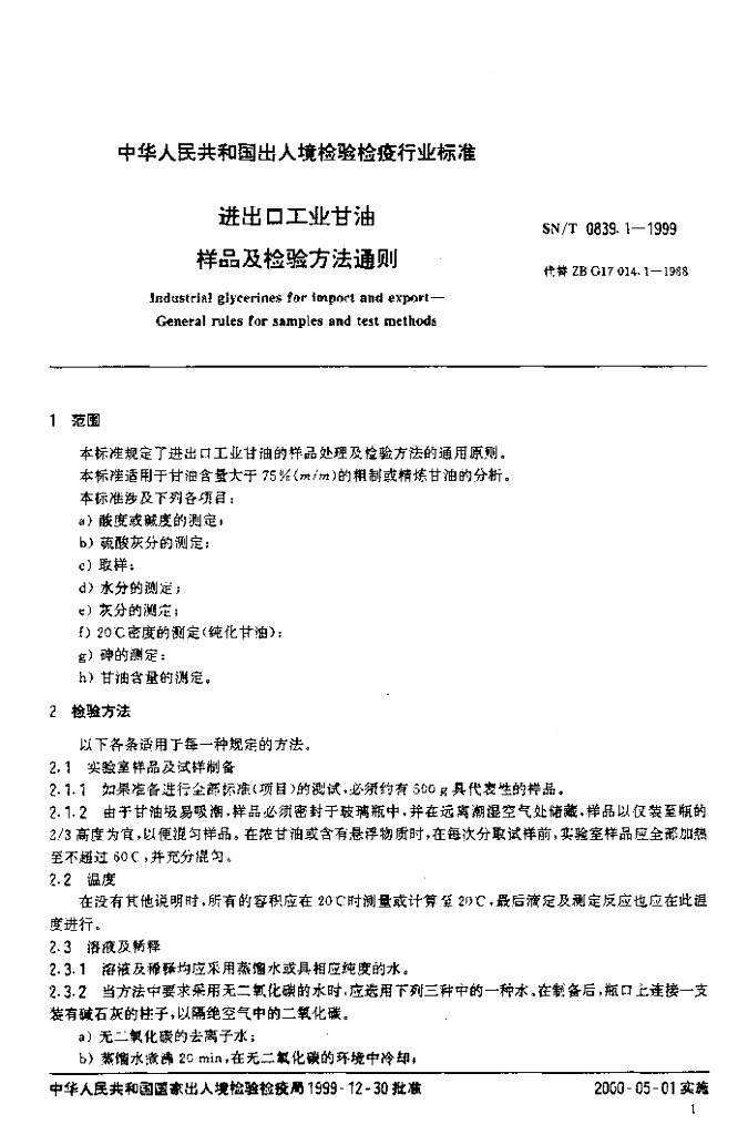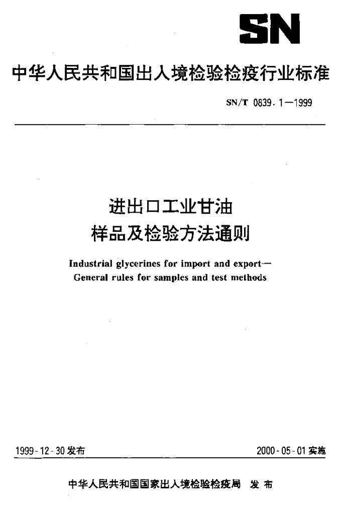 SN/T 0839.1-1999 进出口工业甘油样品及检验方法通则