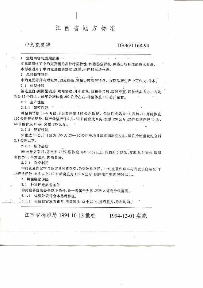 DB36/T 168-1994 中约克夏猪