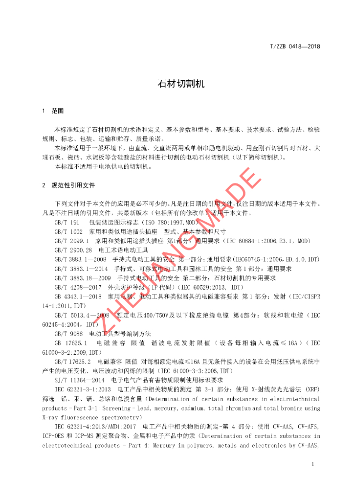 T/ZZB 0418-2018 石材切割机