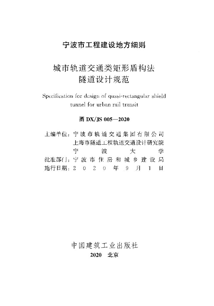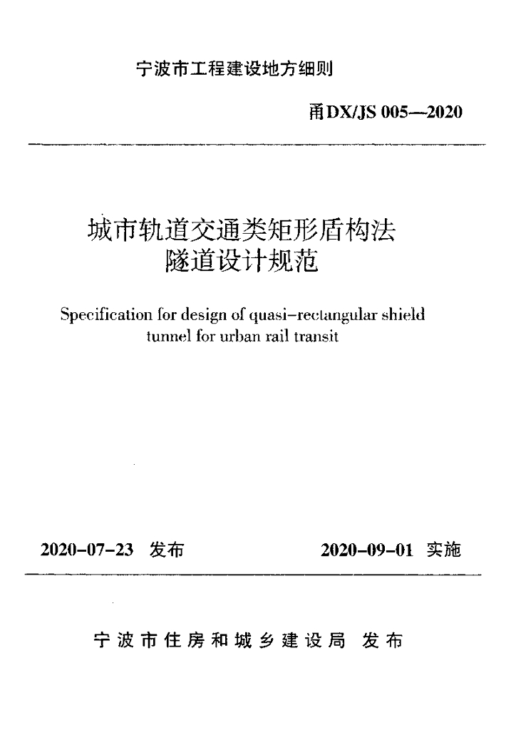 甬DX/JS 005-2020 城市轨道交通类矩形盾构法隧道设计规范