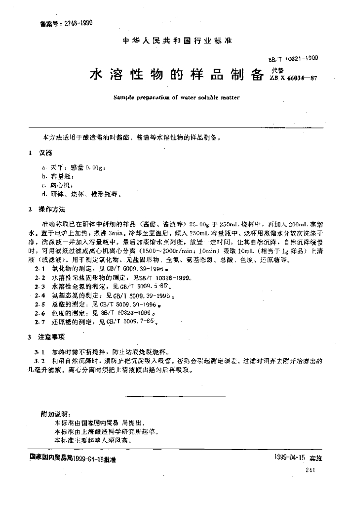 SB/T 10321-1999 水溶性物的样品制备