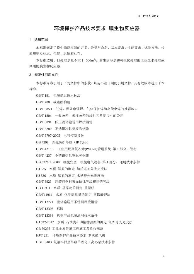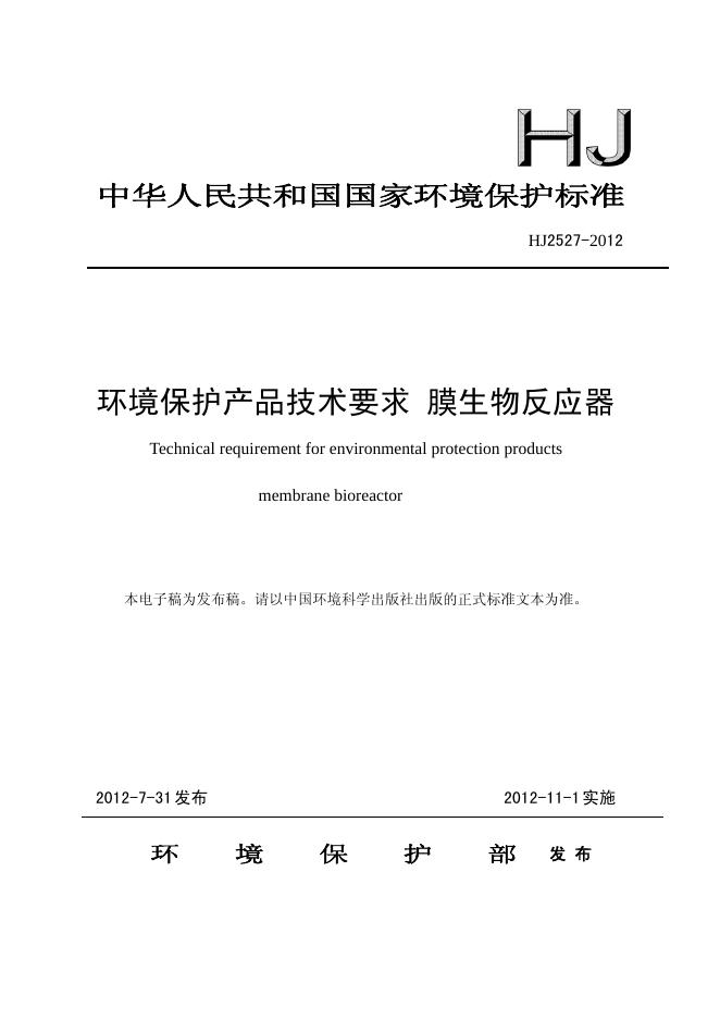 HJ 2527-2012 环境保护产品技术要求 膜生物反应器