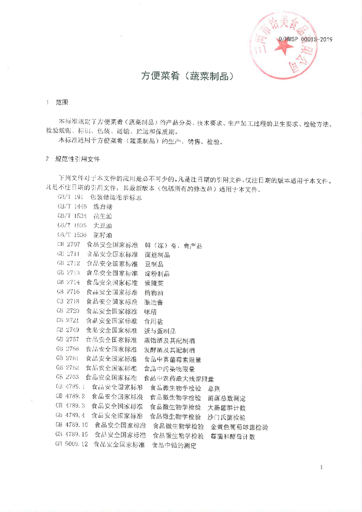 Q/HMSP 0001S-2019 方便菜肴(蔬菜制品)