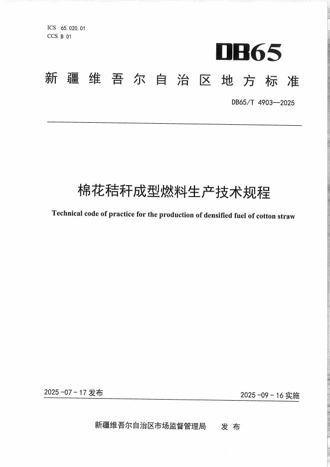 DB65/T 4903-2025 棉花秸秆成型燃料生产技术规程