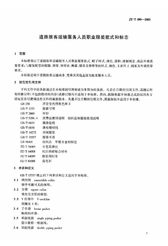 JT/T 490-2003 道路旅客运输服务人员职业服装款式和标志