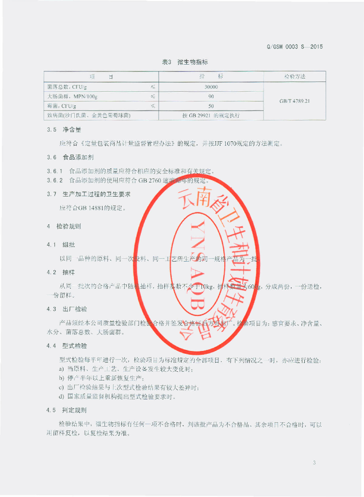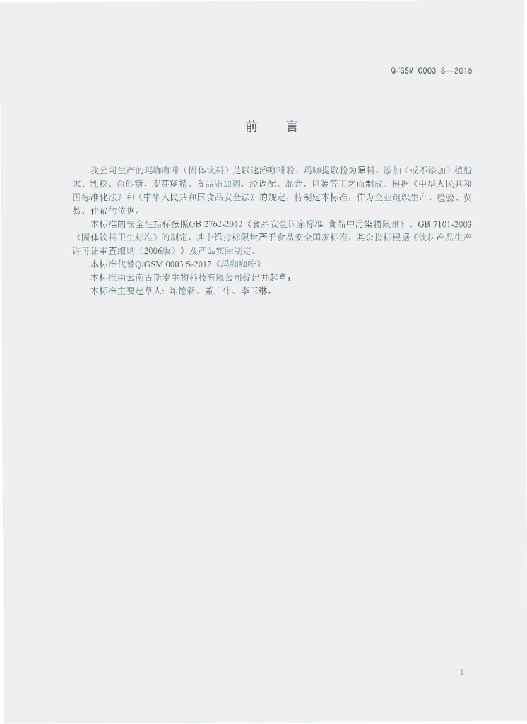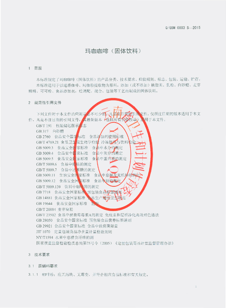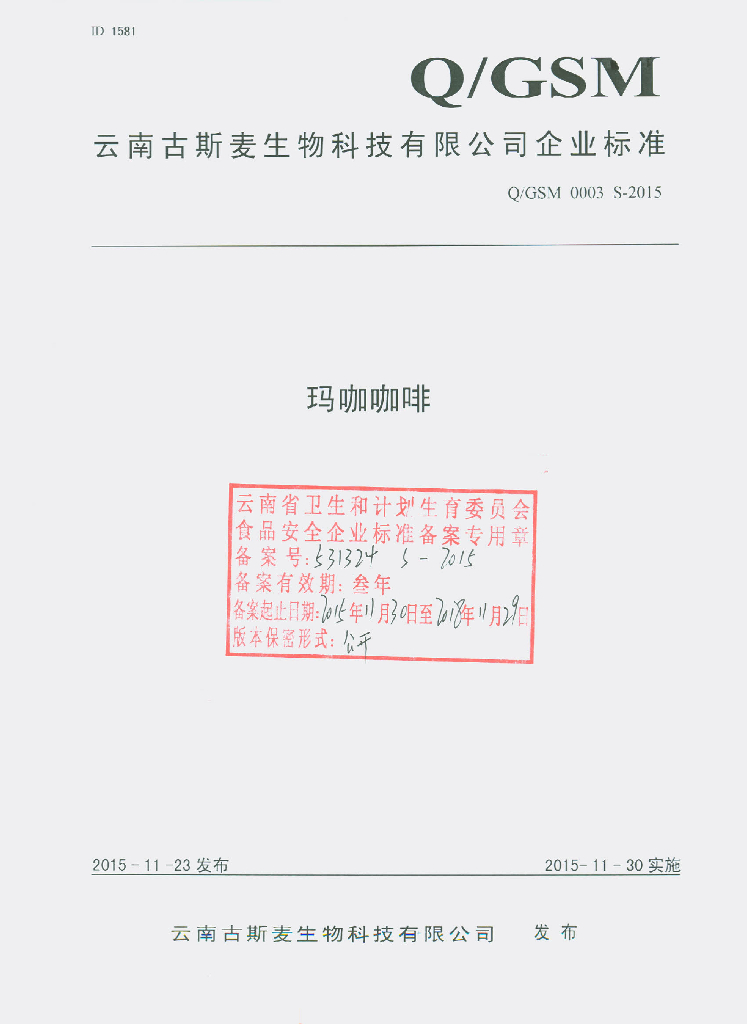 Q/GSM 0003S-2015 云南古斯麦生物科技有限公司 玛咖咖啡