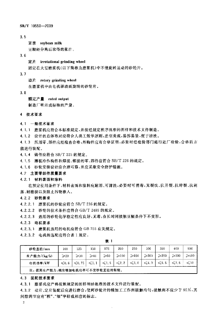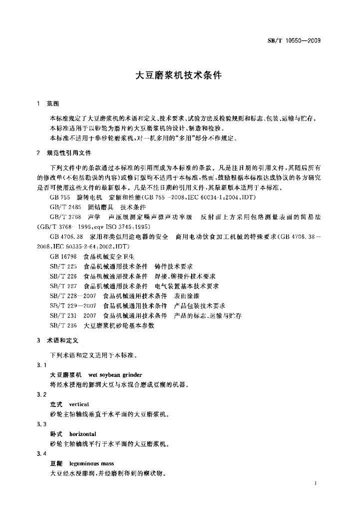 SB/T 10550-2009 大豆磨浆机技术条件标准