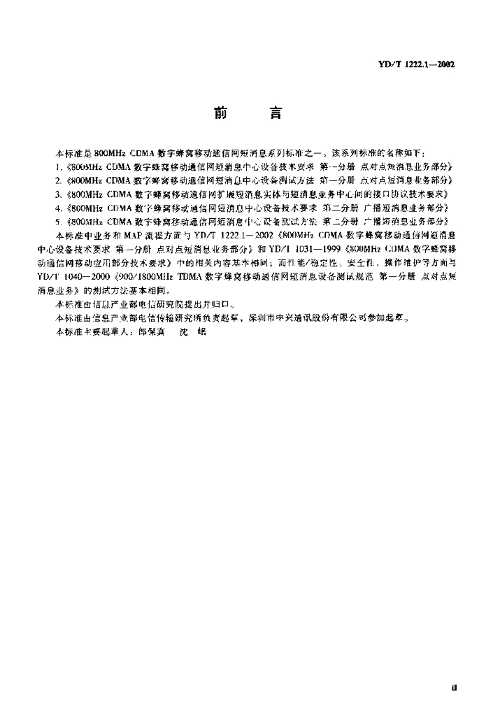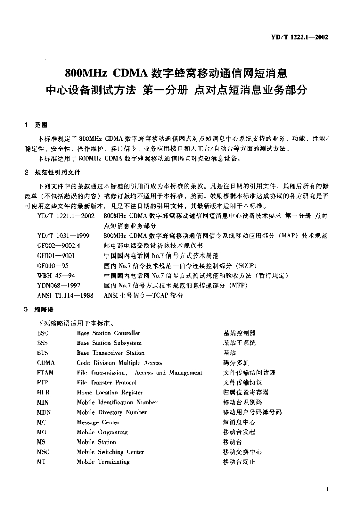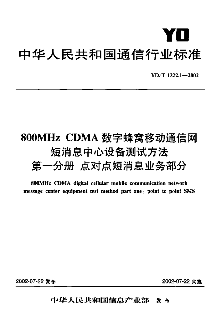 YD/T 1222.1-2002 800MHz CDMA数字蜂窝移动通信网短消息中心设备测试方法 第一分册 点对点短消息业务部分