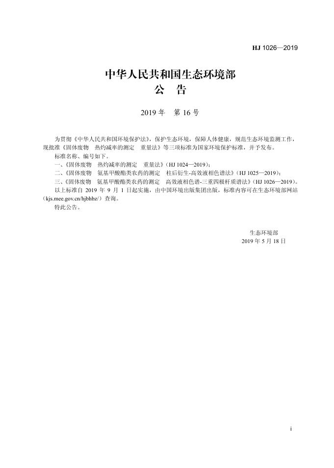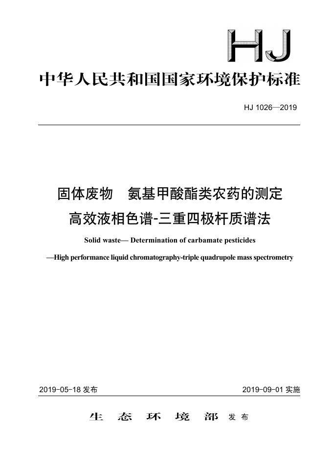 HJ 1026-2019 固体废物 氨基甲酸酯类农药的测定 高效液相色谱-三重四极杆质谱法