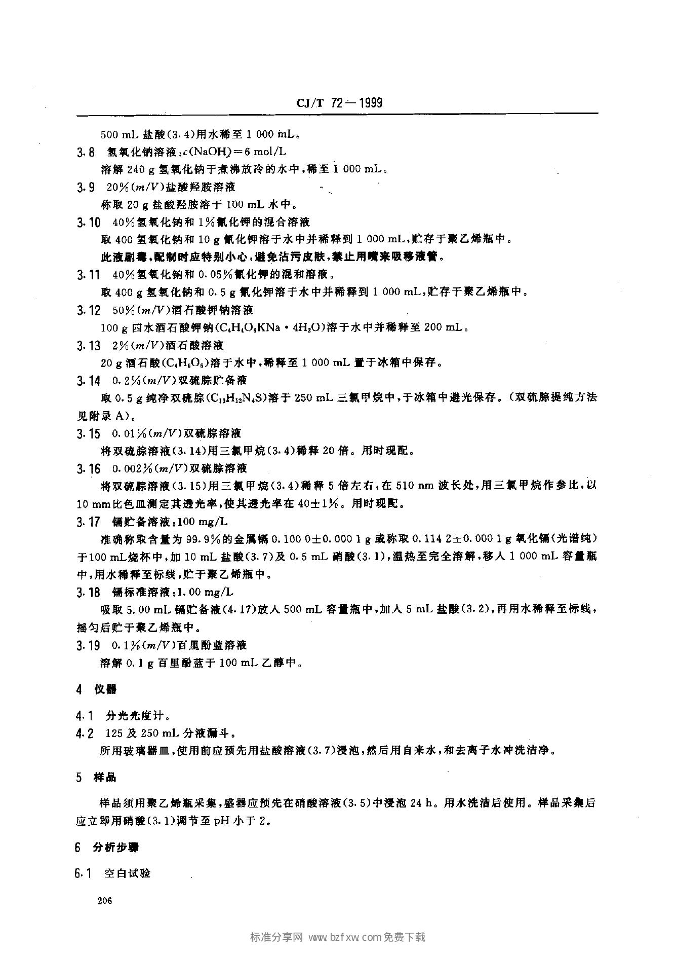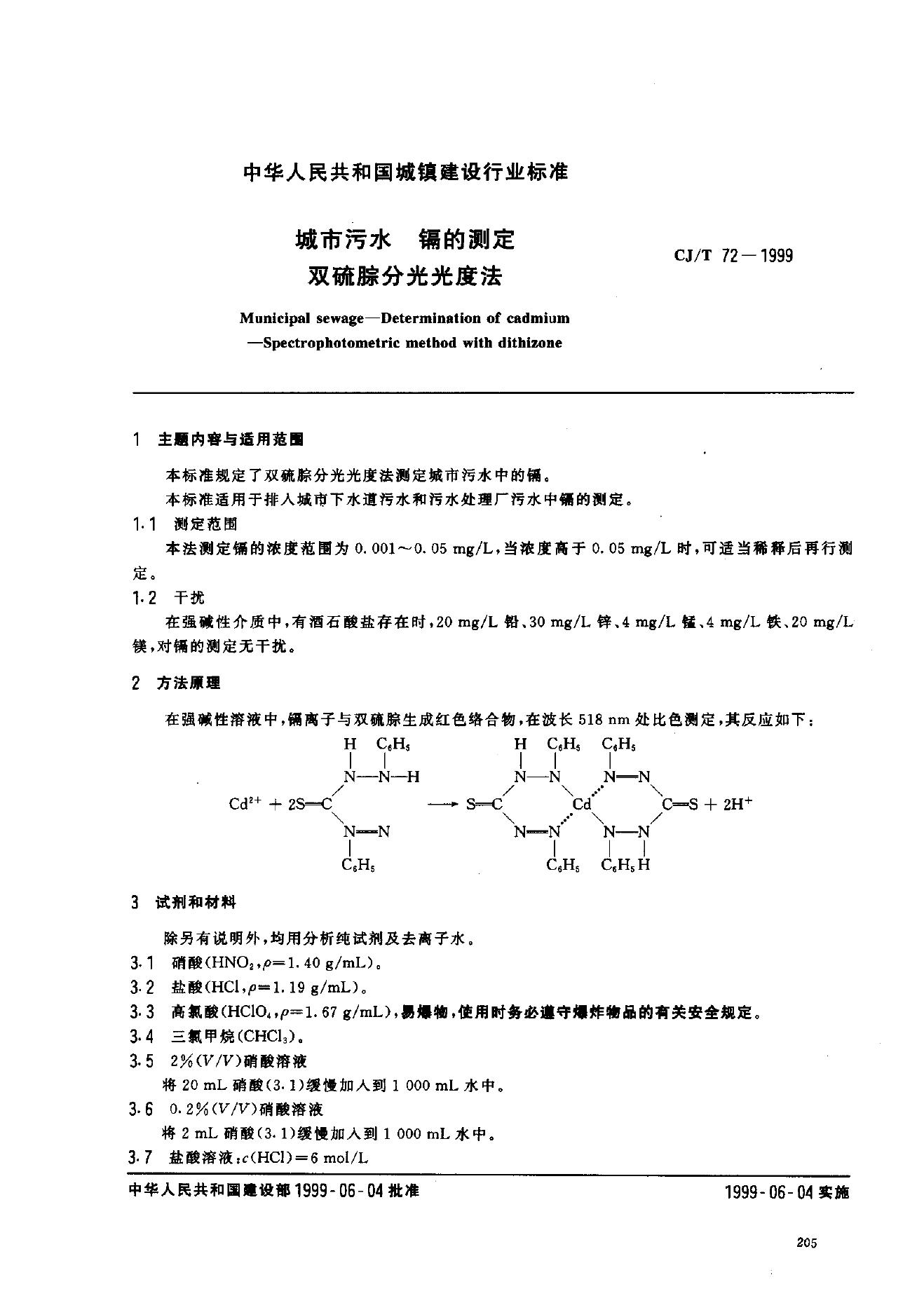 CJ/T 72-1999 城市污水 镉的测定 双硫腙分光光度法
