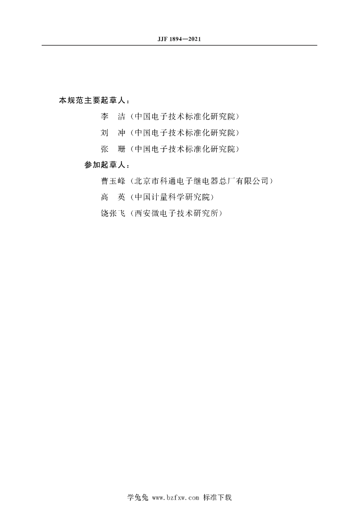 李洁(中国电子技术标准化研究院)、刘冲(中国电子技术标准化研究院)、张珊(中国电子技术标准化研究院)、曹玉峰(北京市科通电子继电器总厂有限公司)、高英(中国计量科学研究院)、饶张飞(西安微电子技术研究所)