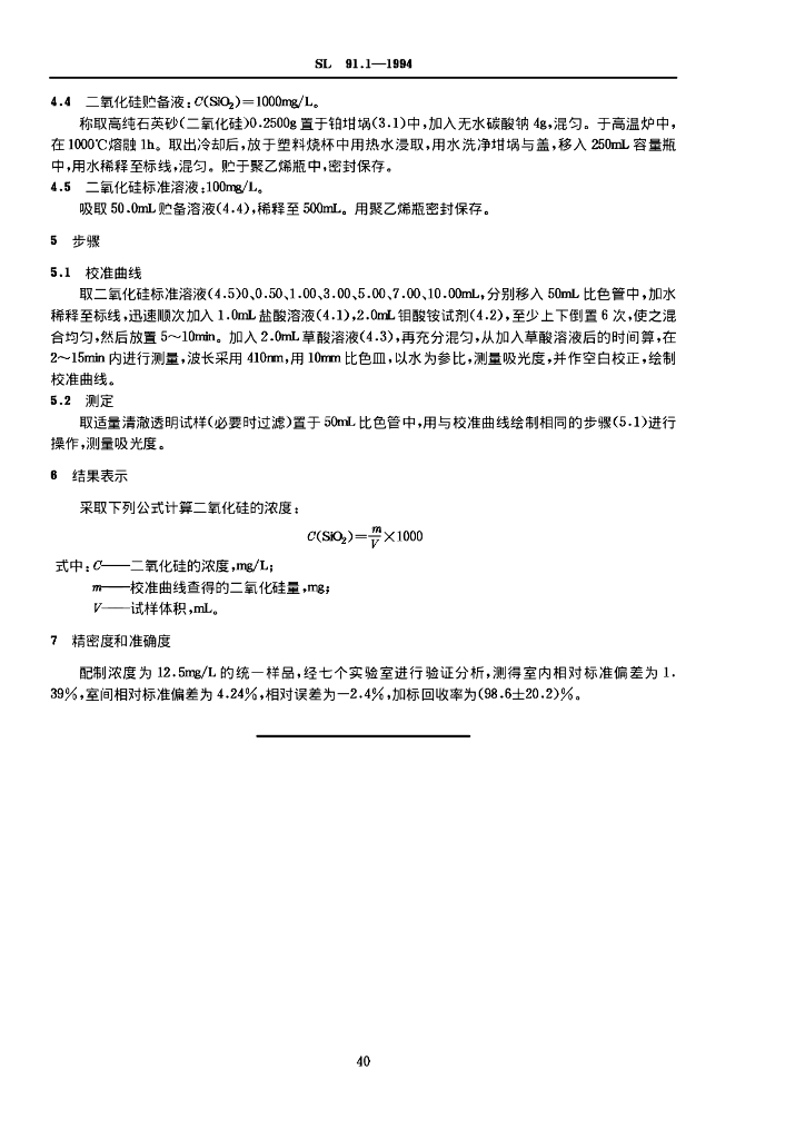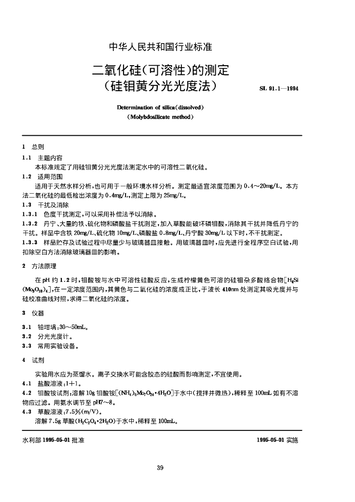 SL 91.1-1994 二氧化硅(可溶性)的测定 (硅钼黄分光光度法)