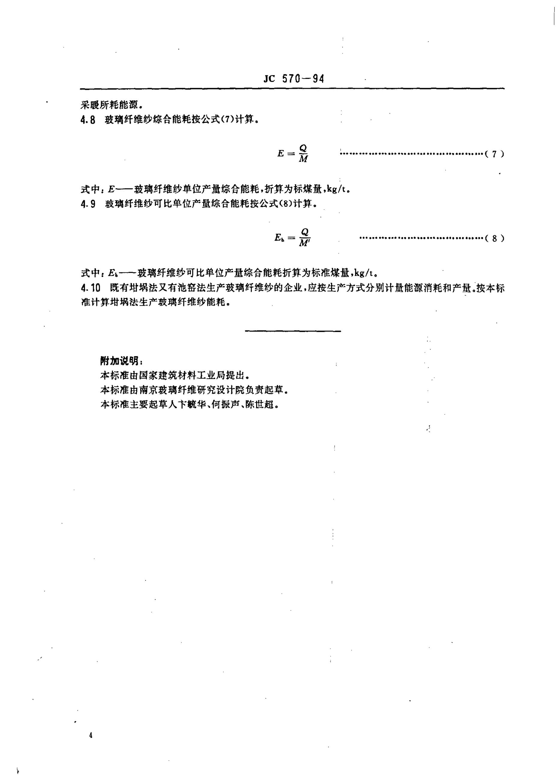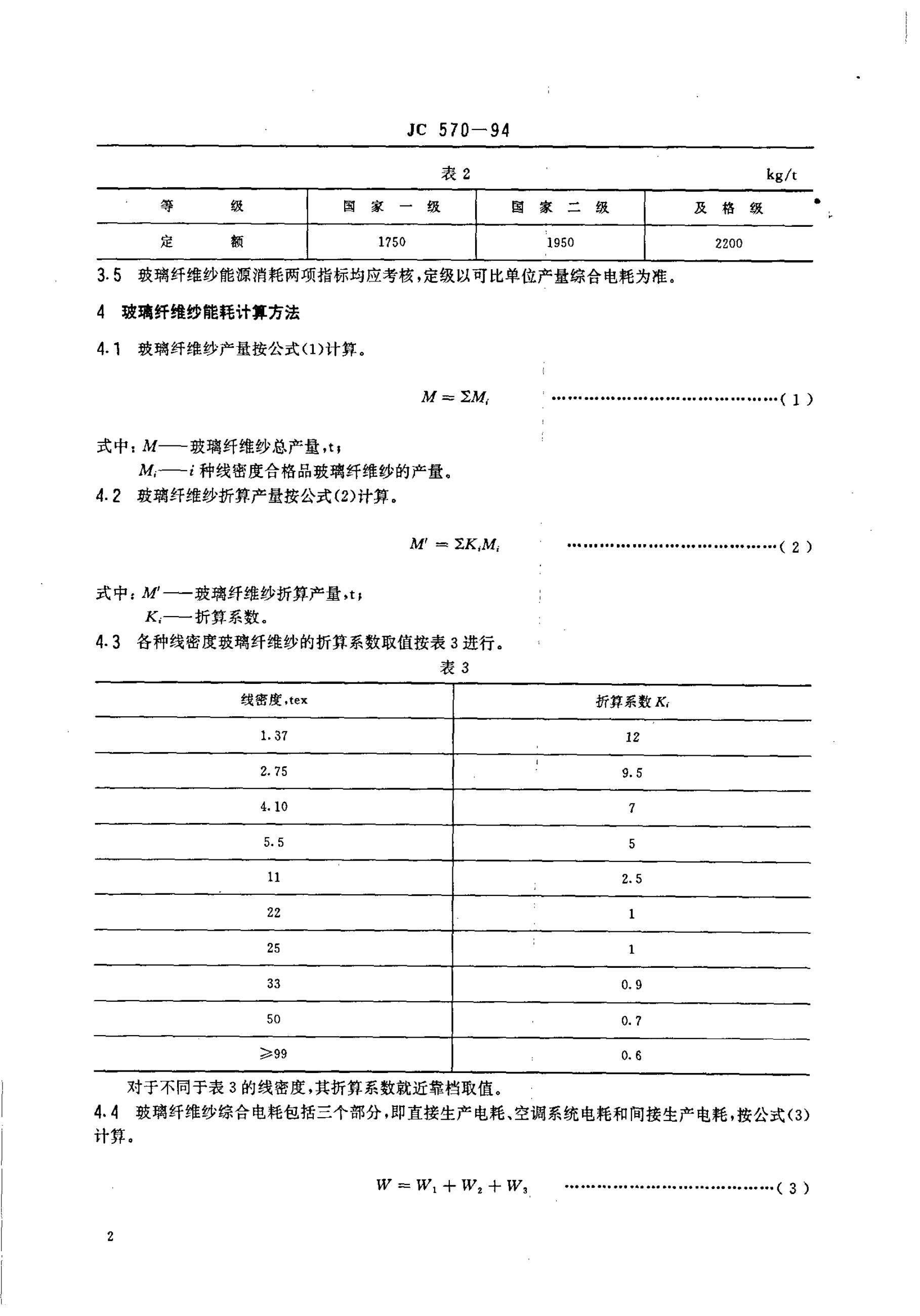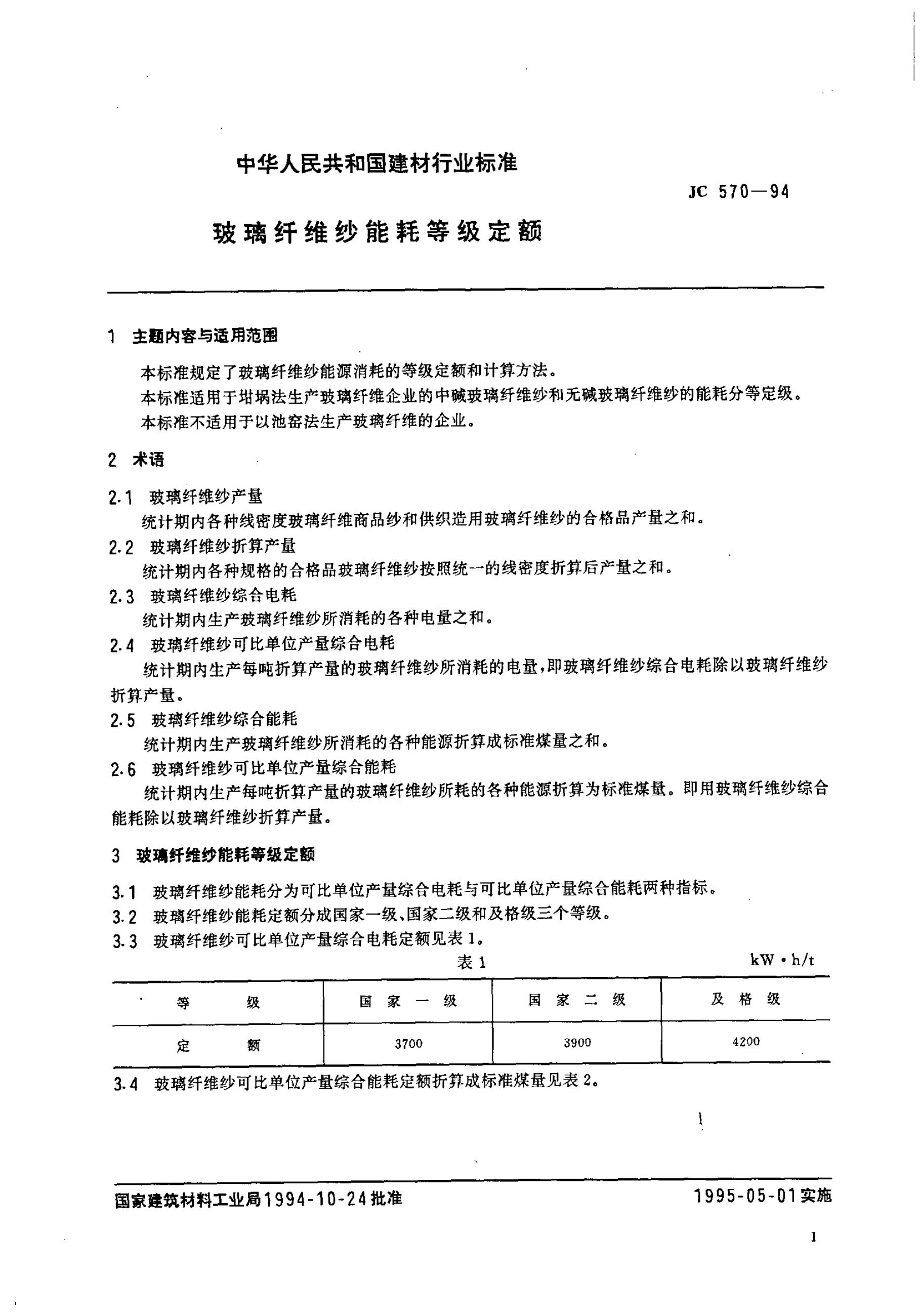 JC 570-1994 玻璃纤维纱能耗等级定额