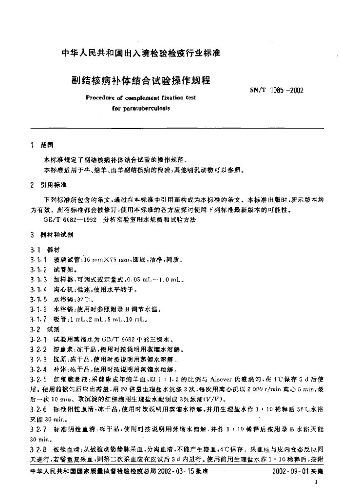 SN/T 1085-2002 副结核病补体结合试验操作规程