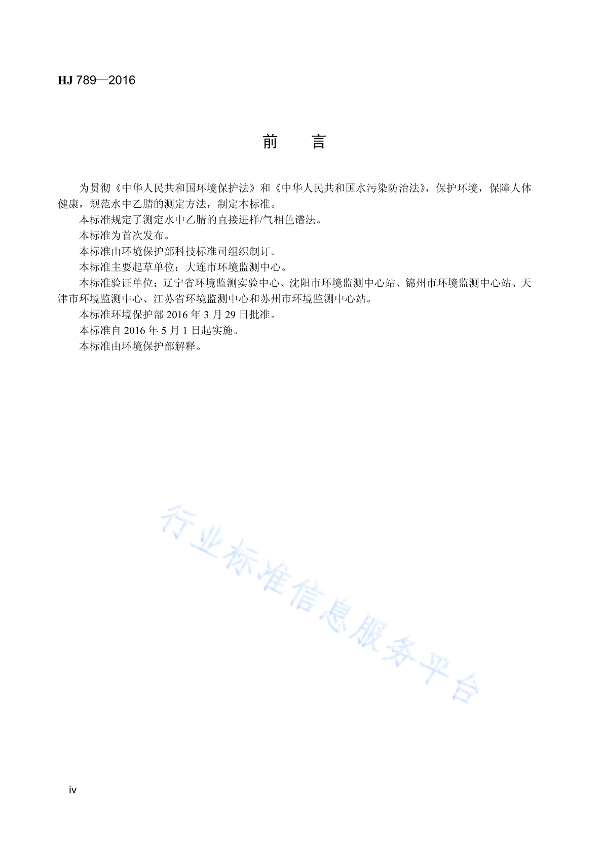 HJ 789-2016 水质 乙腈的测定 直接进样/气相色谱法
