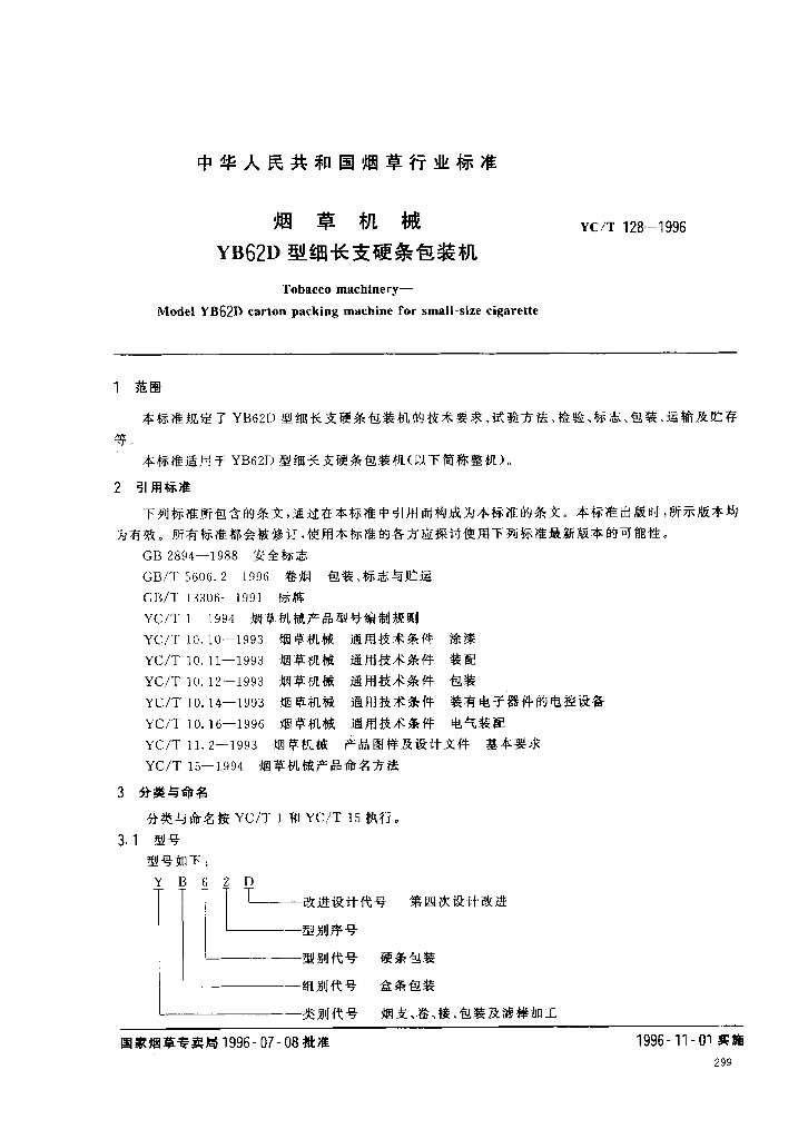 YC/T 128-1996 烟草机械 YB62D型细长支硬条包装机
