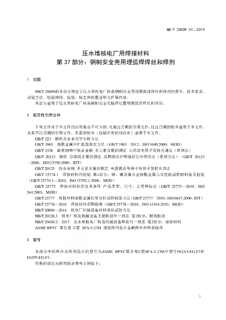 NB/T 20009.37-2019 压水堆核电厂用焊接材料 第37部分:钢制安全壳用埋弧焊焊丝和焊剂