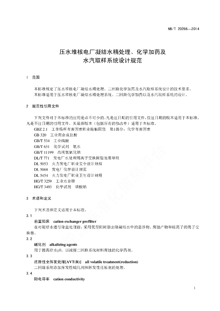 NB/T 20266-2014 压水堆核电厂凝结水精处理、化学加药及水汽取样系统设计规范