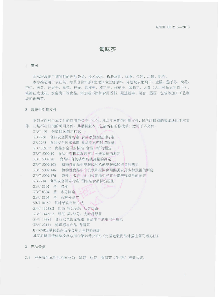 Q/XGT 0012S-2013 云南下关沱茶(集团)股份有限公司 调味茶