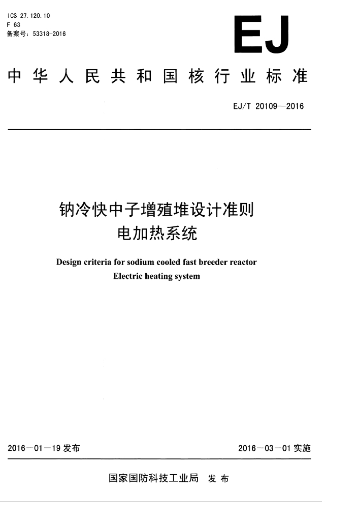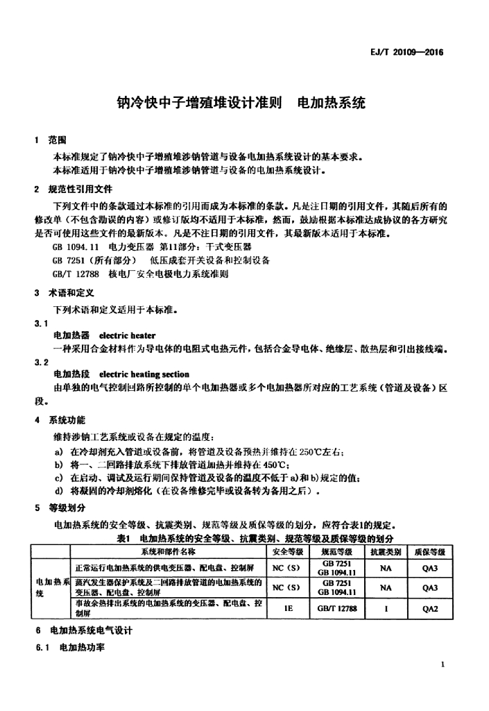 EJ/T 20109-2016 钠冷快中子增殖堆设计准则 电加热系统