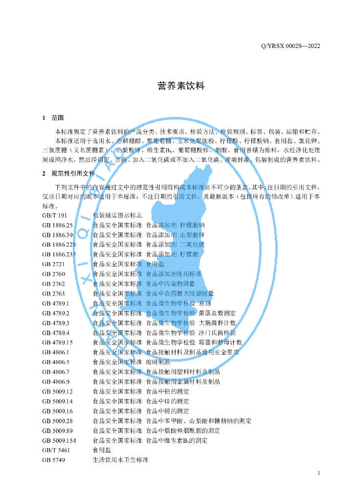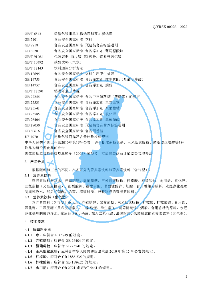Q/YRSX 0002S-2022 营养素饮料