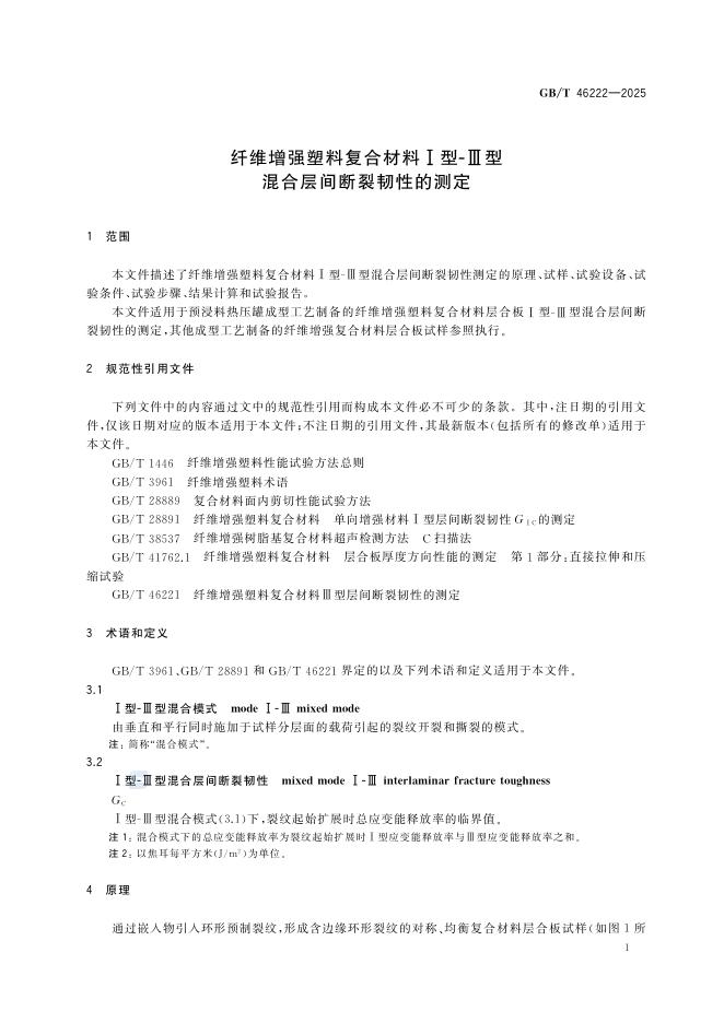 GB/T 46222-2025 纤维增强塑料复合材料I型-III型混合层间断裂韧性的测定