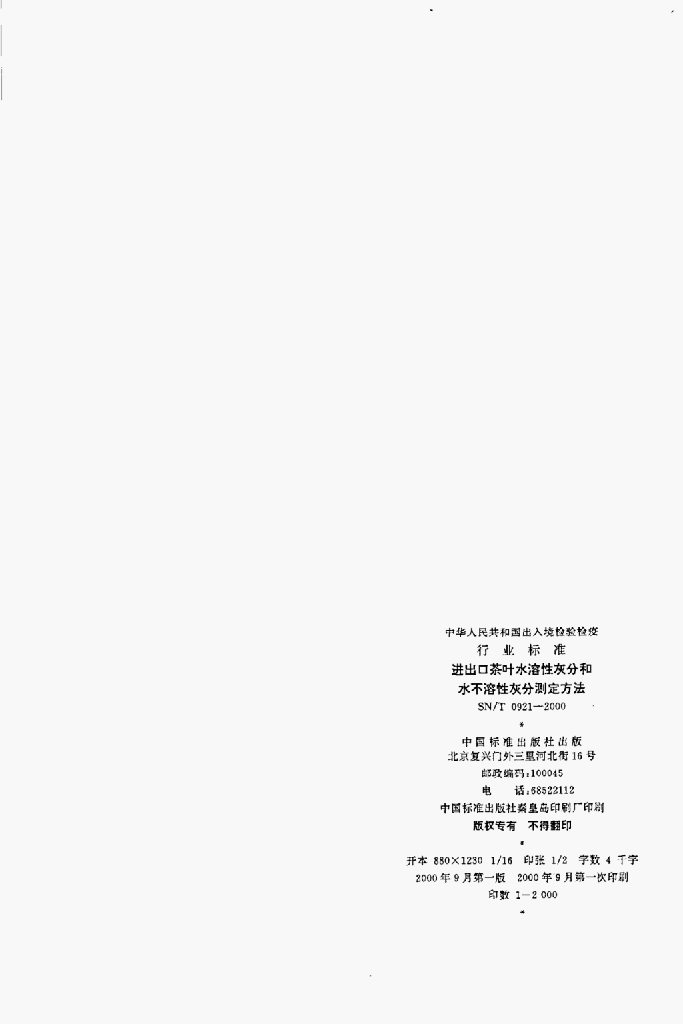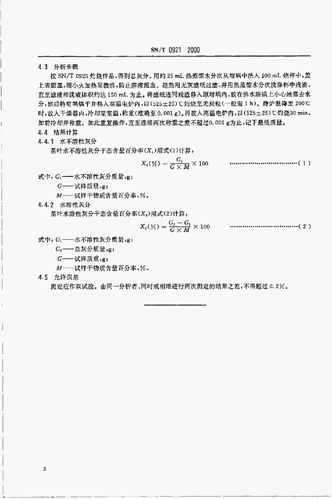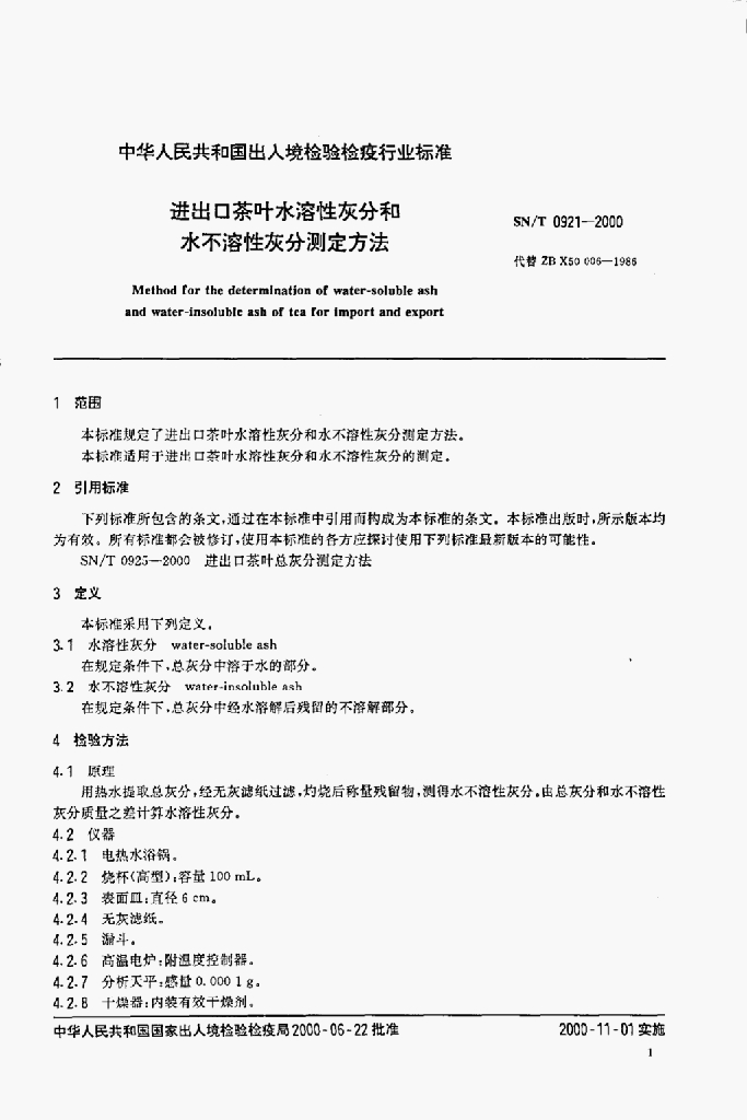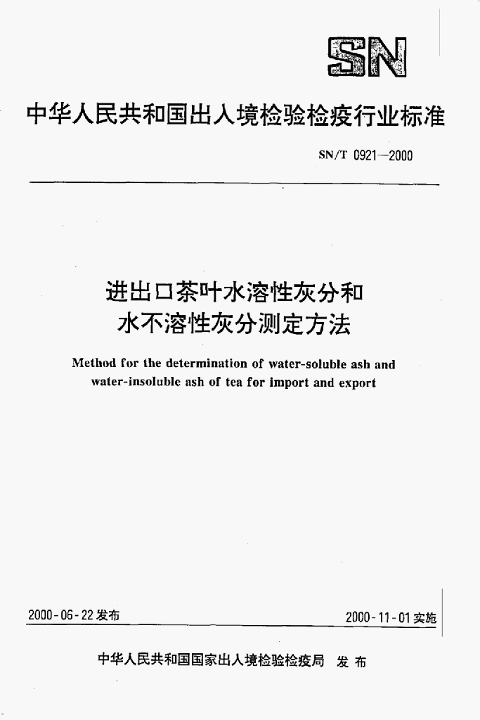 SN/T 0921-2000 进出口茶叶水溶性灰分和水不溶性灰分测定方法