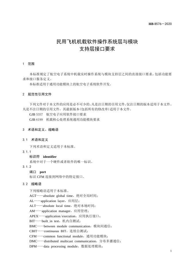 HB 8576-2020 民用飞机机载软件操作系统层与模块支持层接口要求