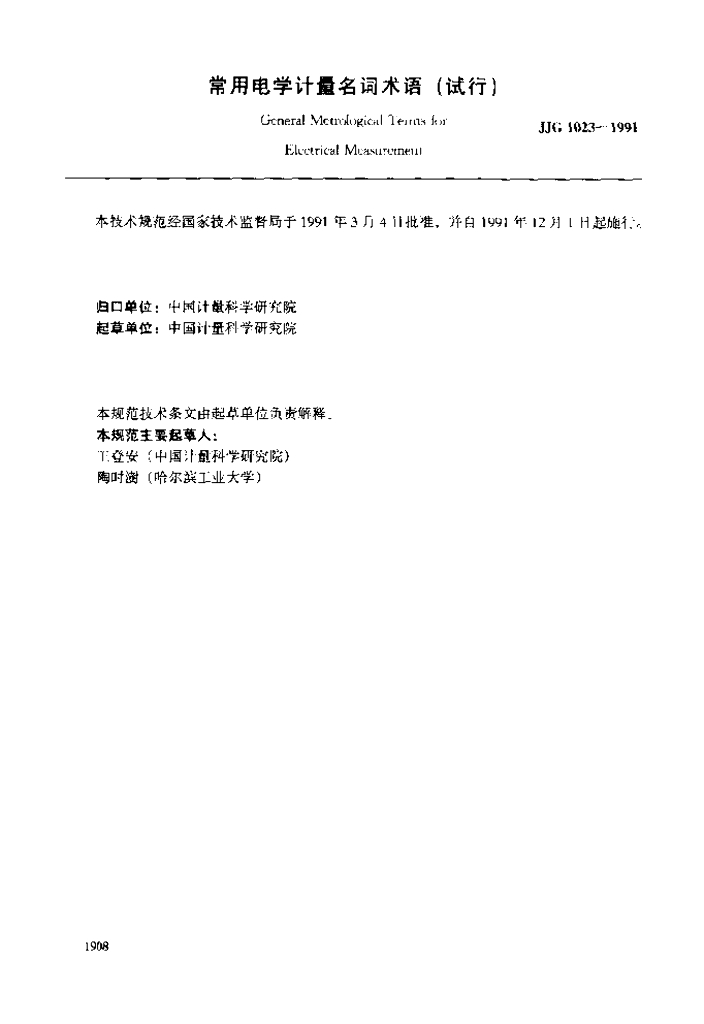JJF 1023-1991 常用电学计量名词术语(试行)