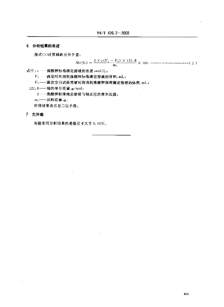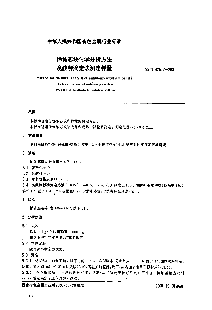 YS/T 426.2-2000 锑铍芯块化学分析方法溴酸钾滴定法测定锑量