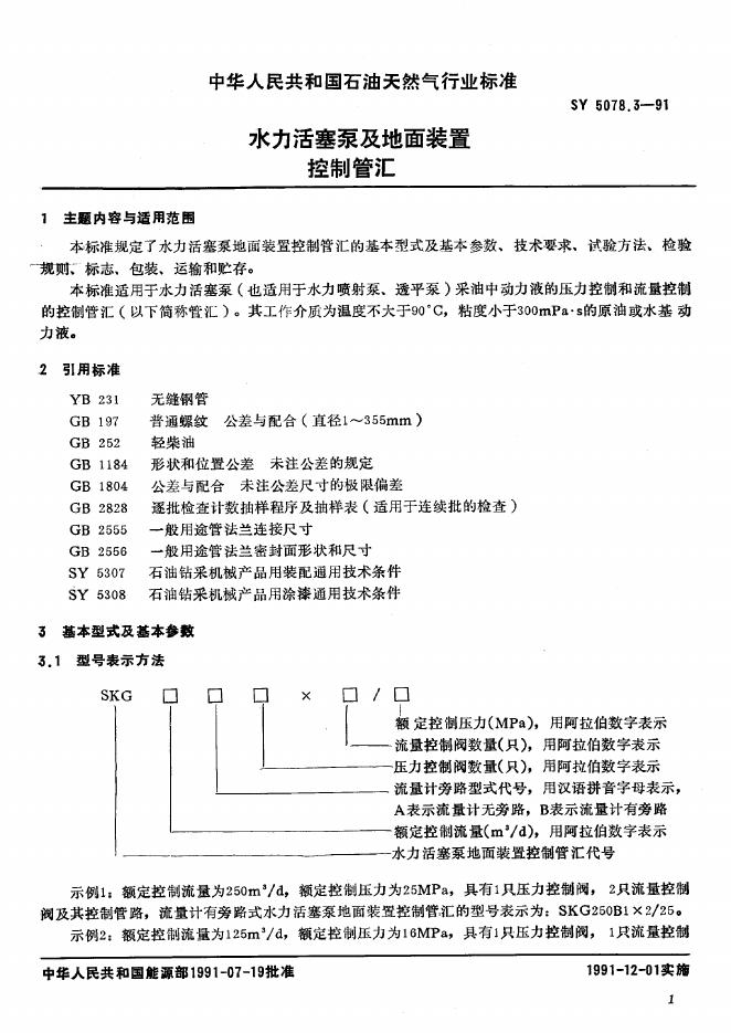 SY 5078.3-1991 水力活塞泵及地面装置 控制管汇