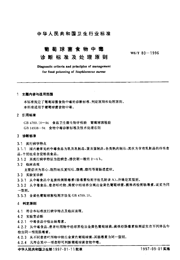 WS/T 80-1996 葡萄球菌食物中毒诊断标准及处理原则