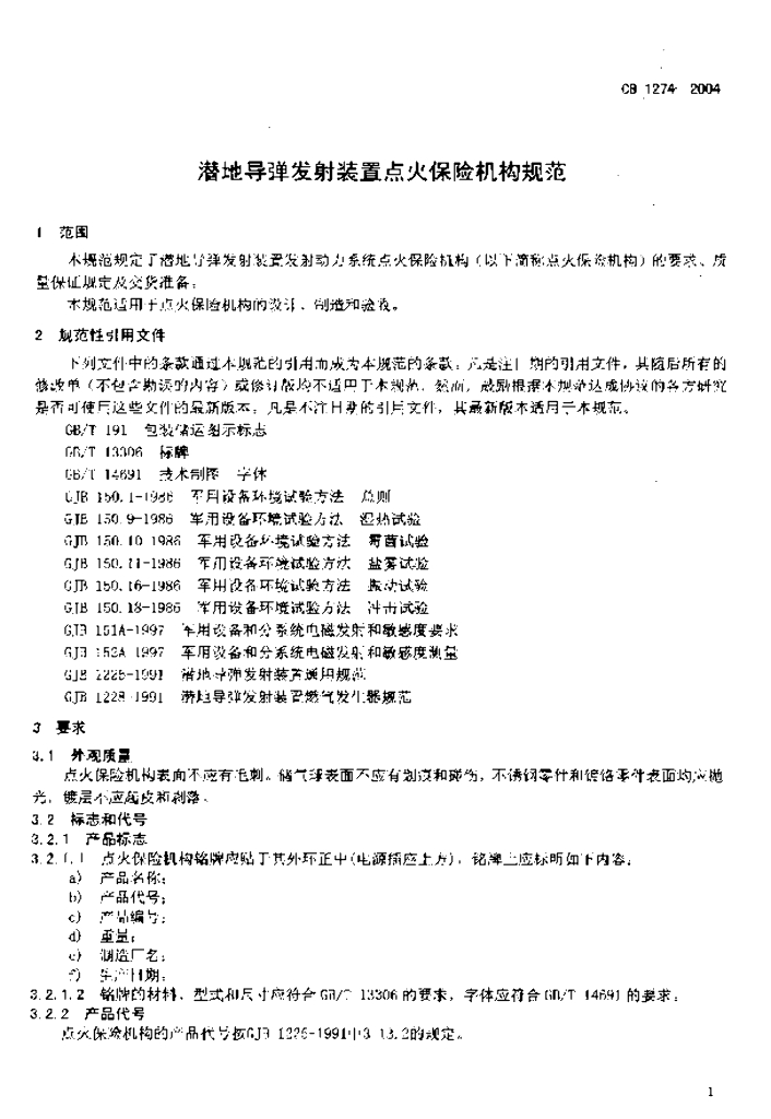 CB 1274-2004 潜地导弹发射装置点火保险机构规范