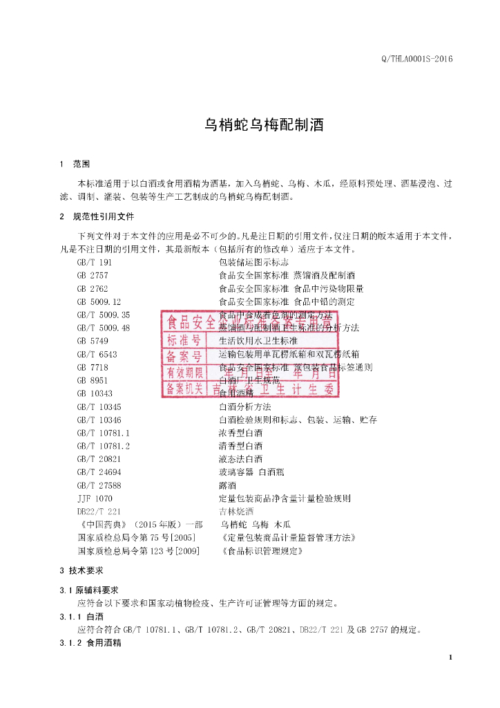 Q/THLA 0001S-2016 通化市力安生物高科有限公司 乌梢蛇乌梅配制酒