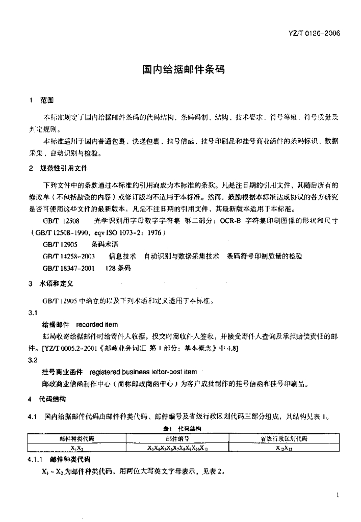 YZ/T 0126-2006 国内给据邮件条码